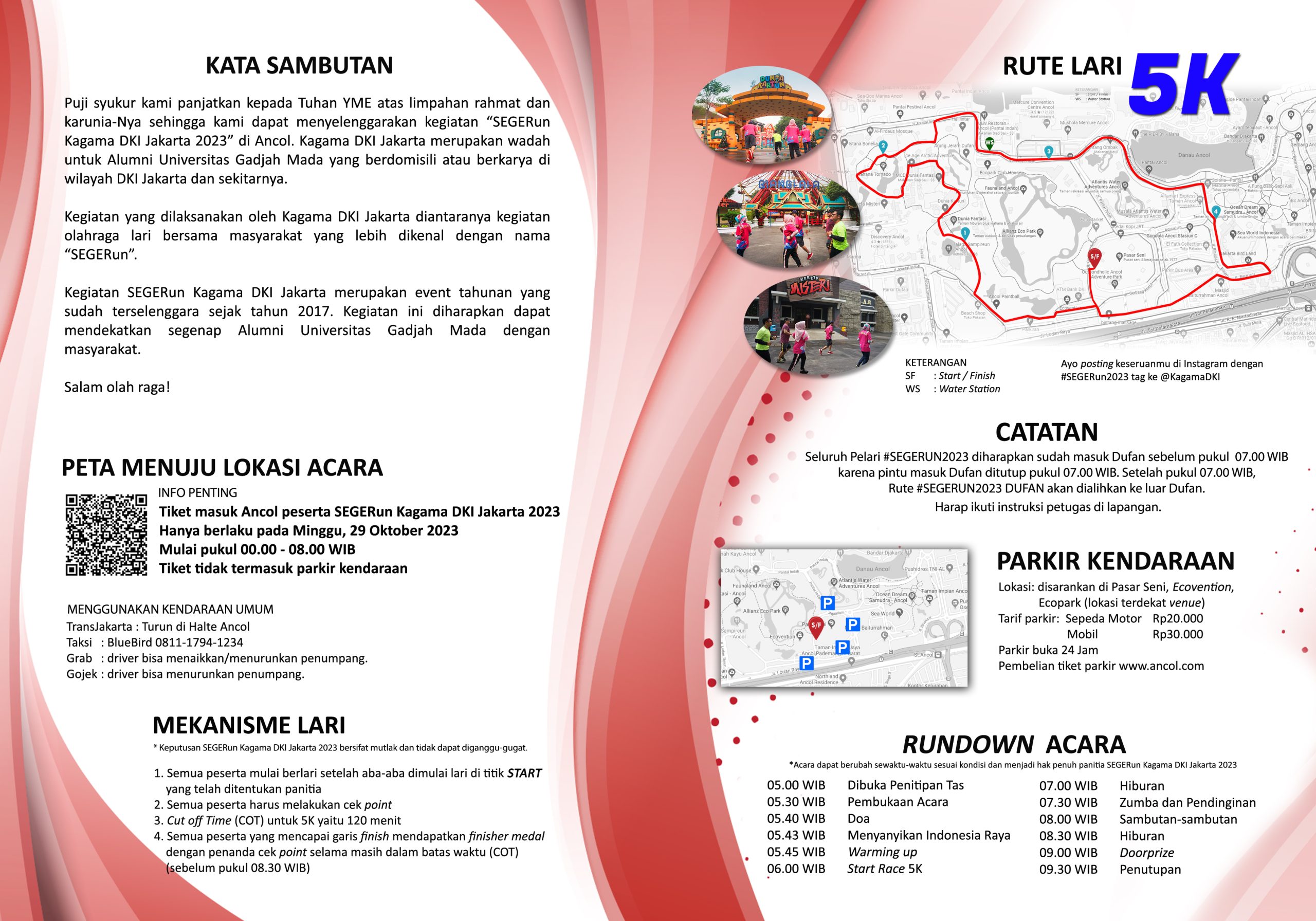 Kagama DKI Jakarta kembali menggelar event lari SEGERUN 2023 dengan konsep fun run 5K yang akan dilaksanakan pada hari Minggu, 29 Oktober 2023 mulai pukul 05.30 di Pasar Seni, Ancol, Jakarta.